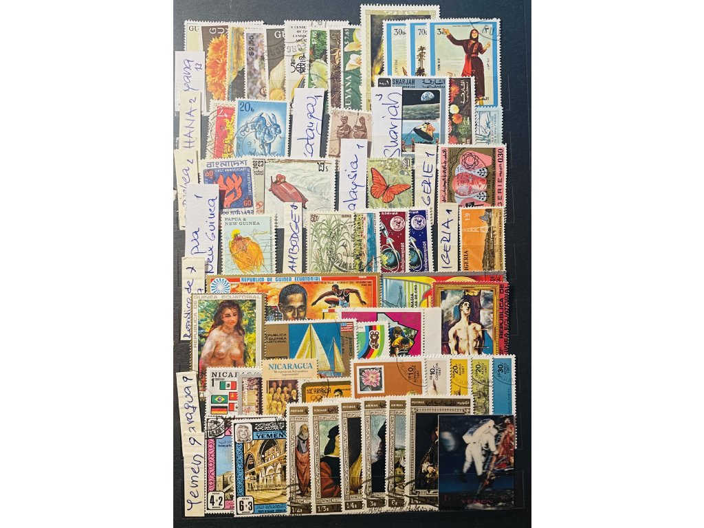 Karta A4 oboustranná 130 ks známek Guyana - Nicaragua - Yemen - Egypt - RSA a další prošlé poštou Θ