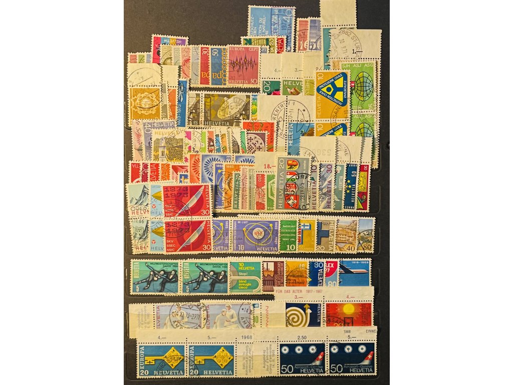 obsahuje: sedící Helvetia, známky s okr., rohové známky, 2 pásky vodorovné i svislé, velmi pěkná razítka