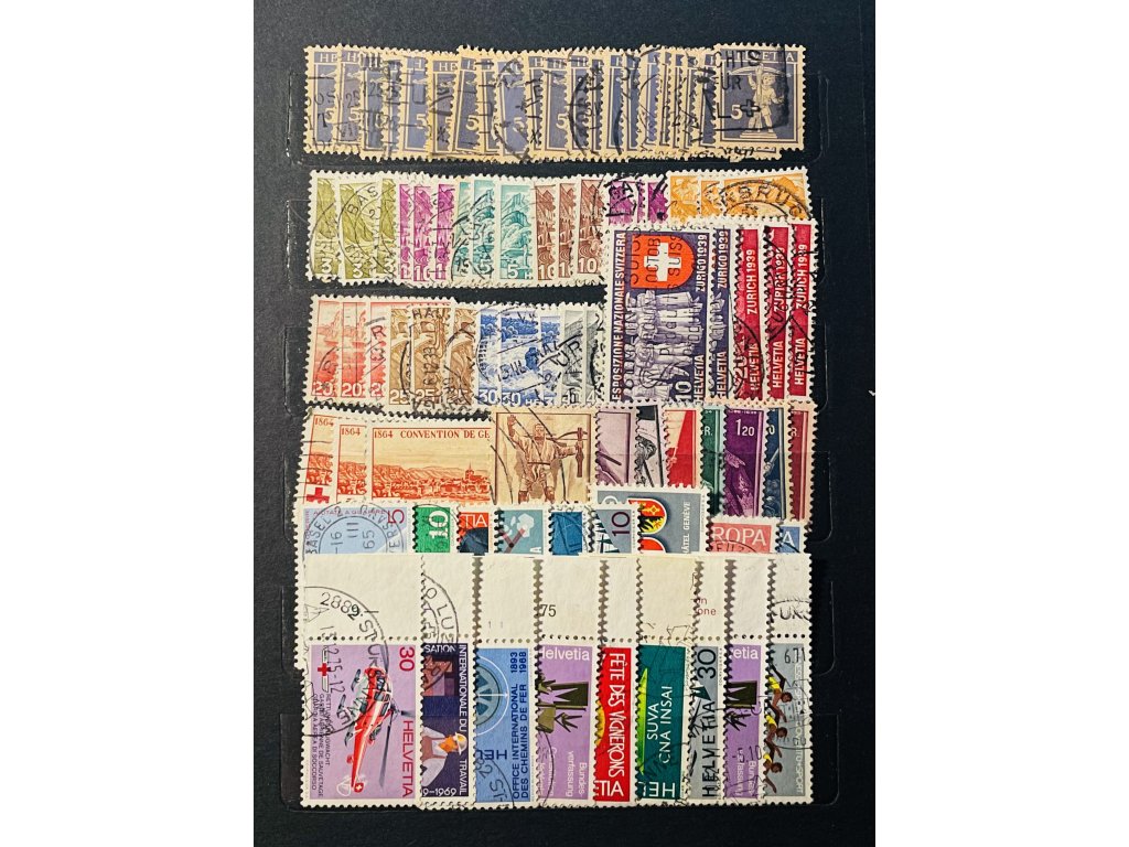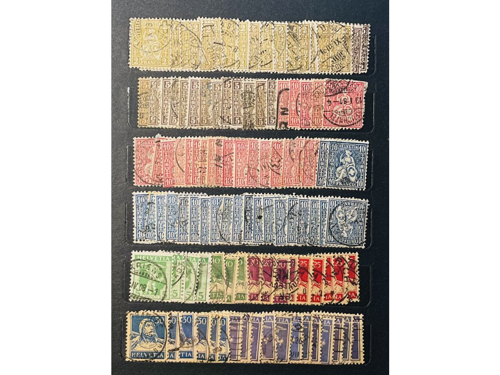 Karta A5 oboustranná Švýcarské prošlé známky 150 ks cca 1/3 sedící Helvetia, pěkná razítka ⊙