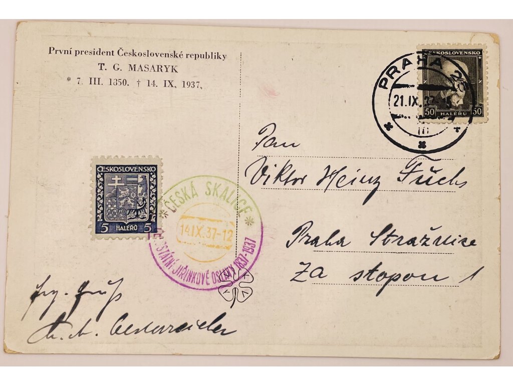 Pohlednice smuteční TGM 7. 3. 1850 - 14. 9. 1937 se známkou 5h Československý státní erb s razítkem Česká Skalice celostátní jiřinkové oslavy 14. 9. 1937.