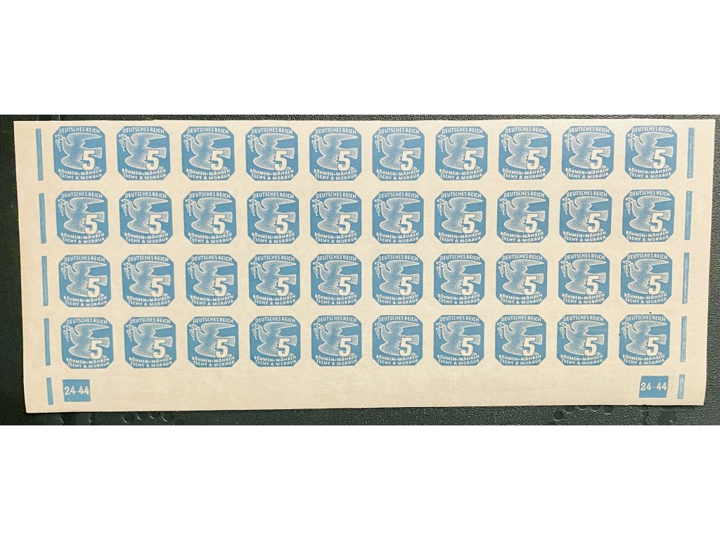 Poštovní známky Protektorát Čechy a Morava - zn. NV11 novinová 5h modrá, vydání II. dolní pás 4X10 s DČ 24 - 44 ** čisté
